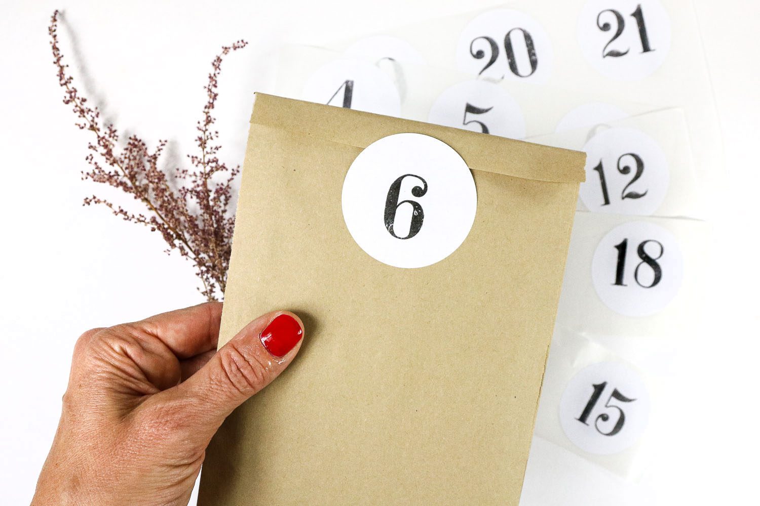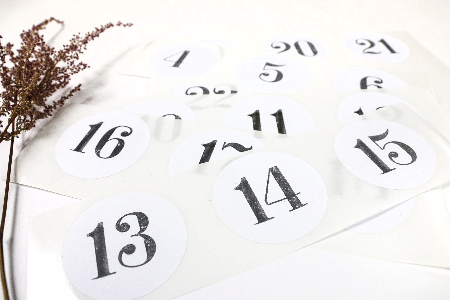 24 handbestempelte Aufkleber mit Adventskalenderzahlen aus Recycling-Papier für Papiertüten & Geschenke: Perfekte Adventskalenderaufkleber für deinen DIY-Adventskalender für Kinder & Erwachsene.