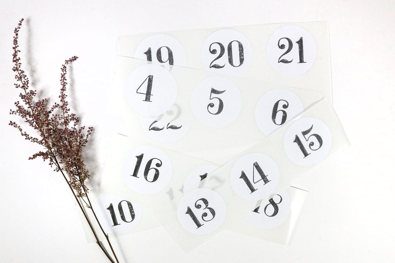 Die minimalistischen Adventskalendernummern verleihen Deinem Weihnachtskalender das gewisse Etwas. Die Zahlenaufkleber sind ideal zum Basteln von Adventskalendern zum Befüllen, sei es für Schachteln, Papiertüten oder Papiersäckchen.