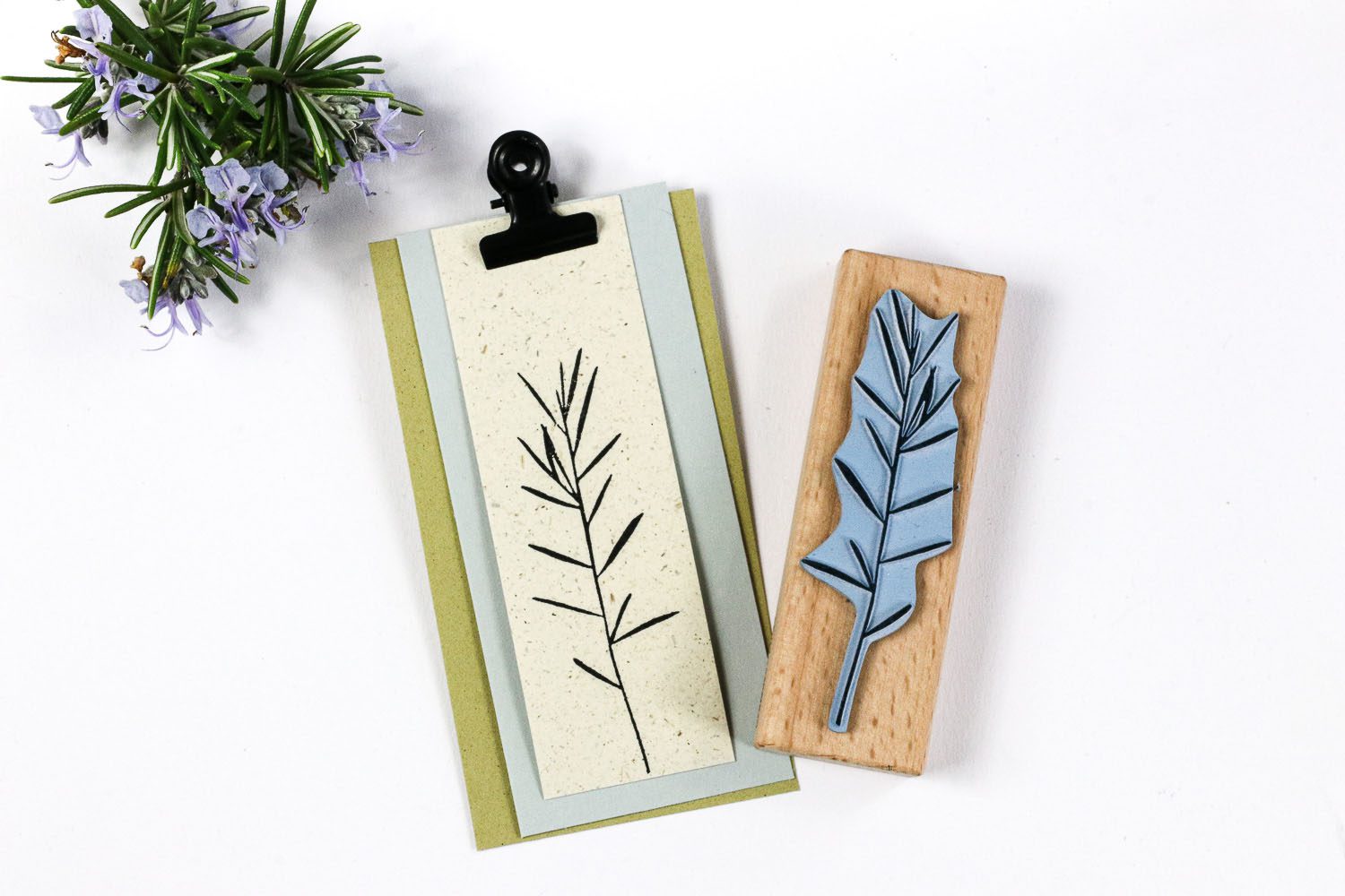 Mit dem Holzstempel mit Rosmarinmotiv gestaltest du im Handumdrehen Karten, Geschenkanhänger, Briefumschläge oder Geschenkverpackungen. Besonders schön wirkt der botanische Stempel in Kombination mit anderen Blumenstempeln, Zweigen oder Schriftstempeln.
