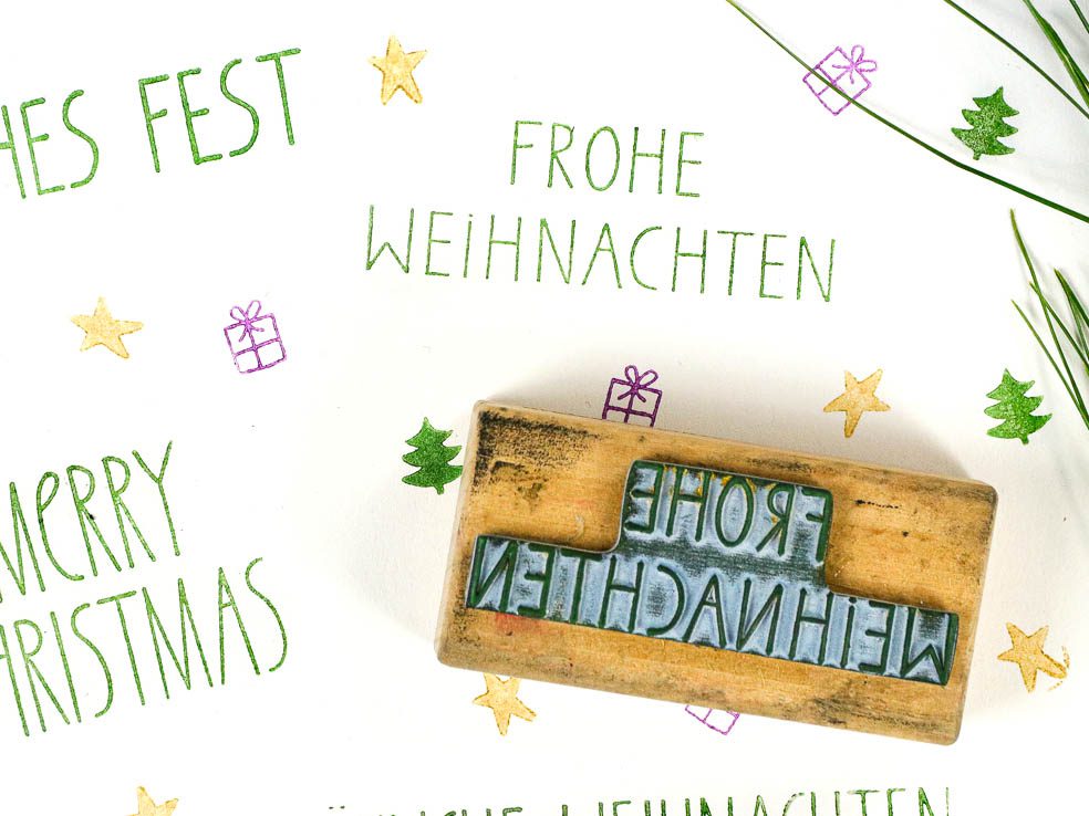 Wie alle Motivstempel von STUDIO KARAMELO basiert auch der Texttempel Frohe Weihnachten auf einem mit Tusche handgeschriebenem Schriftzug.