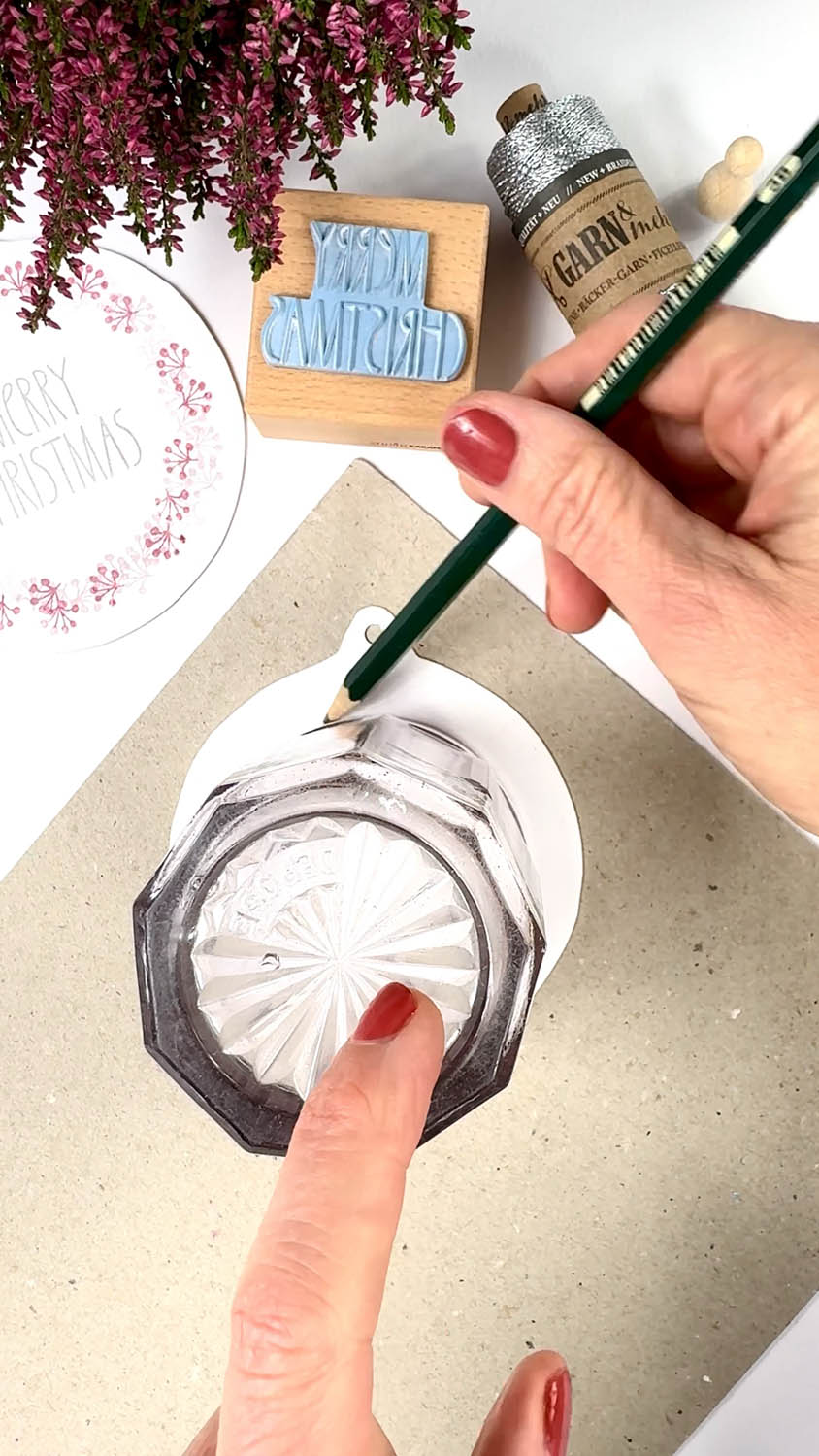 Lege ein Glas oder einen anderen runden Gegenstand mit etwas Abstand zum Rand auf die Weihnachtskugel und ziehe mit einem Bleistift einen feinen, zarten Kreis.