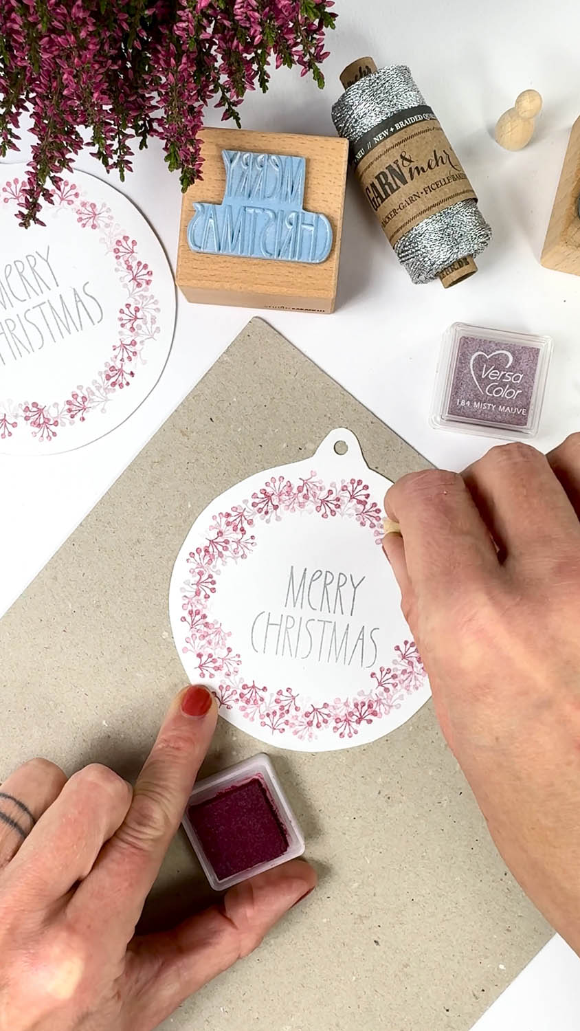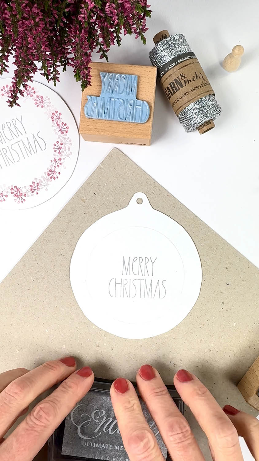 Setze den Textstempel mittig in die Kugel. Ich hab‘ dafür die Stempelfarbe VersaColor in silber gewählt. Die hat so einen schönen metallic Look und glitzert 🙂