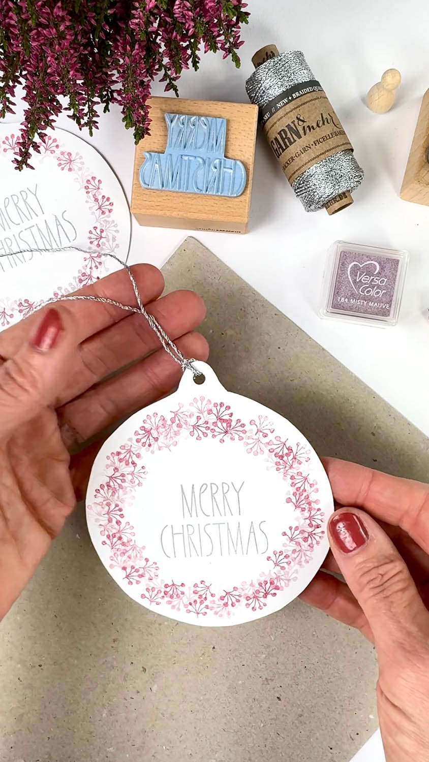 Zum Schluss fädelst du ein Band oder etwas Garn durch das Loch und verknotest es. Jetzt kannst du deinen Weihnachtskugel-Anhänger an Geschenken, Tannenzweigen oder als kleine Deko aufhängen.