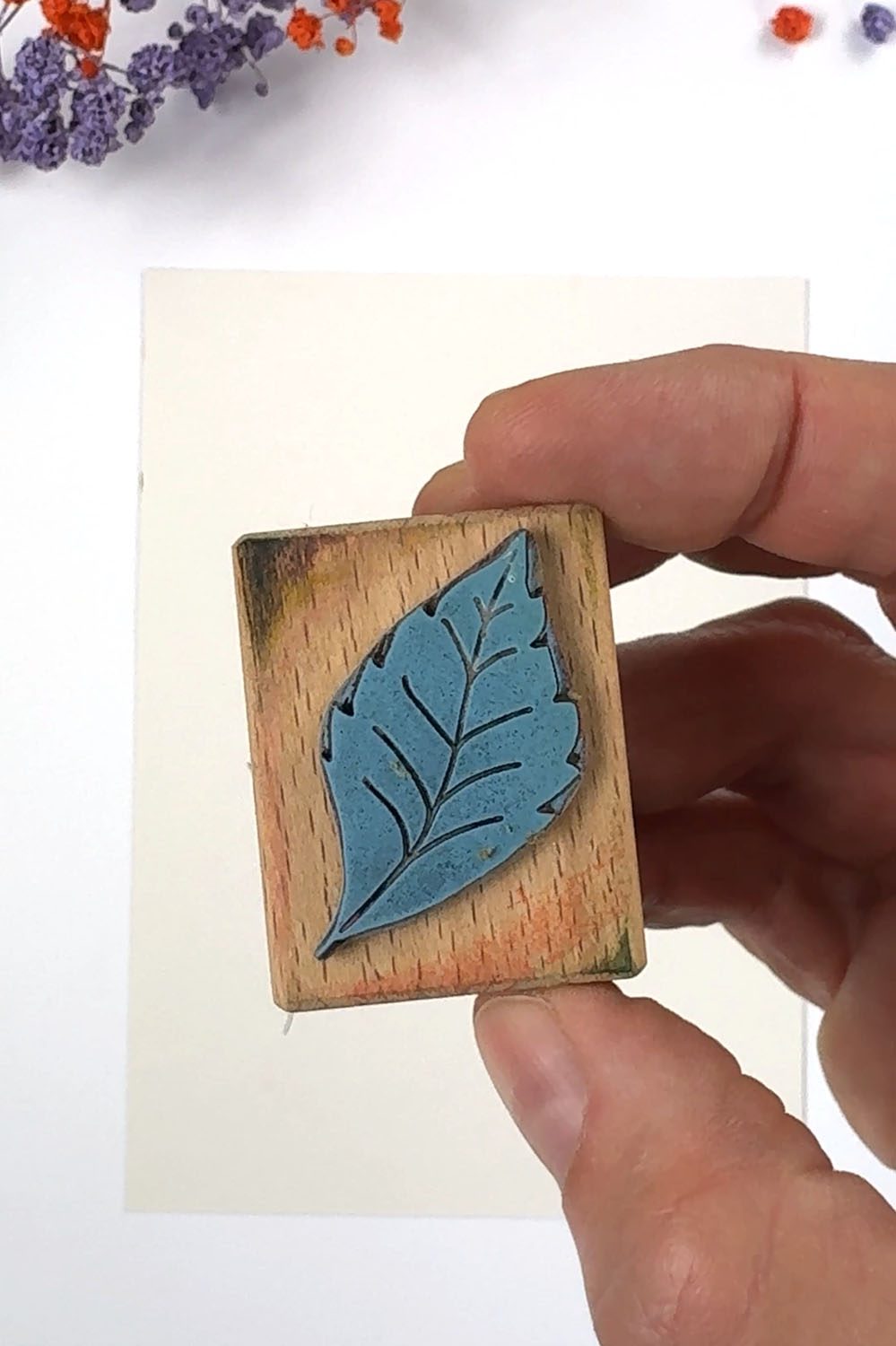 Beginne dann damit das Blatt in der hellsten Farbe an den Ast zu stempeln und fahre mit den anderen Farben fort.