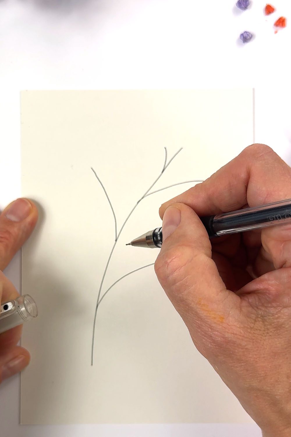 Ziehe zuerst mit dem Fineliner – mit ein bisschen Schwung – einen astartigen Strich auf deine Karte und füge dann noch ein paar seitliche Zweige an.