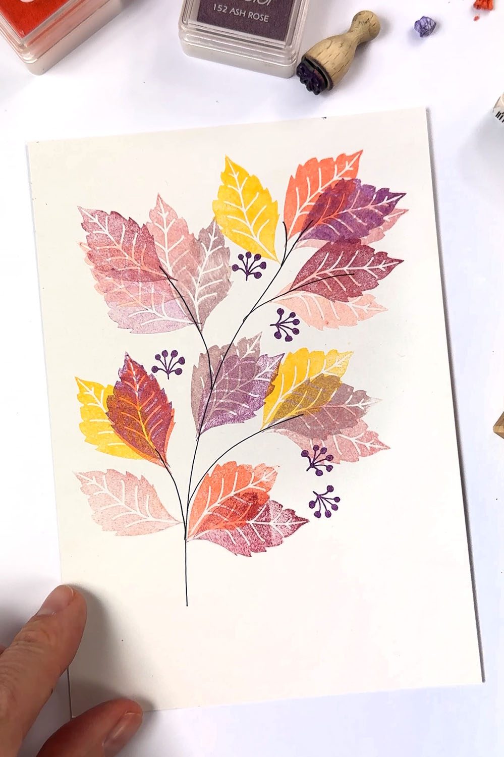 Wenn du die Herbstblätter in allen Farben an deinen Ast gestempelt hast, nimm den kleinen Beerenstempel und setze noch ein paar Akzente zwischen die Blätter.